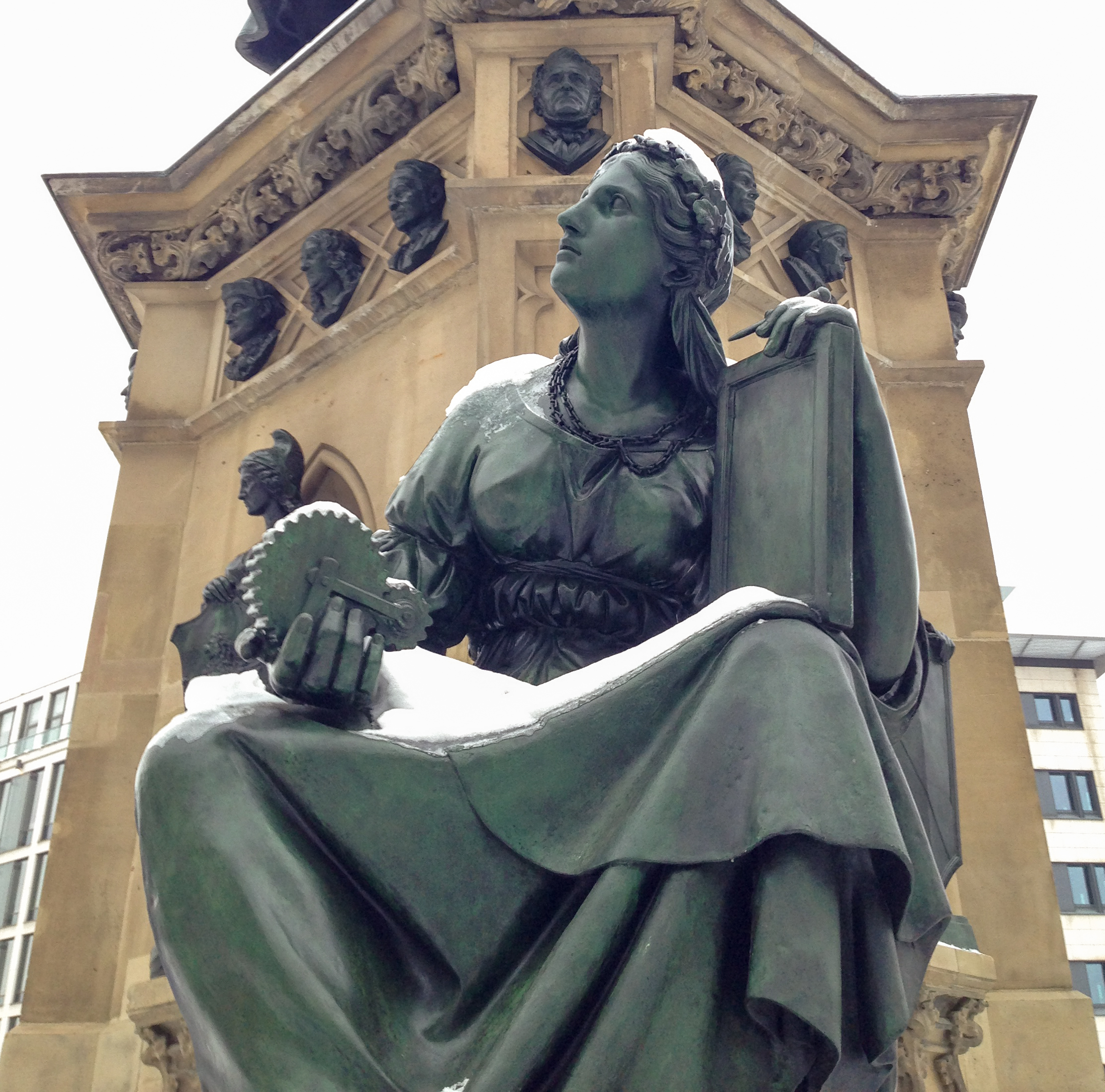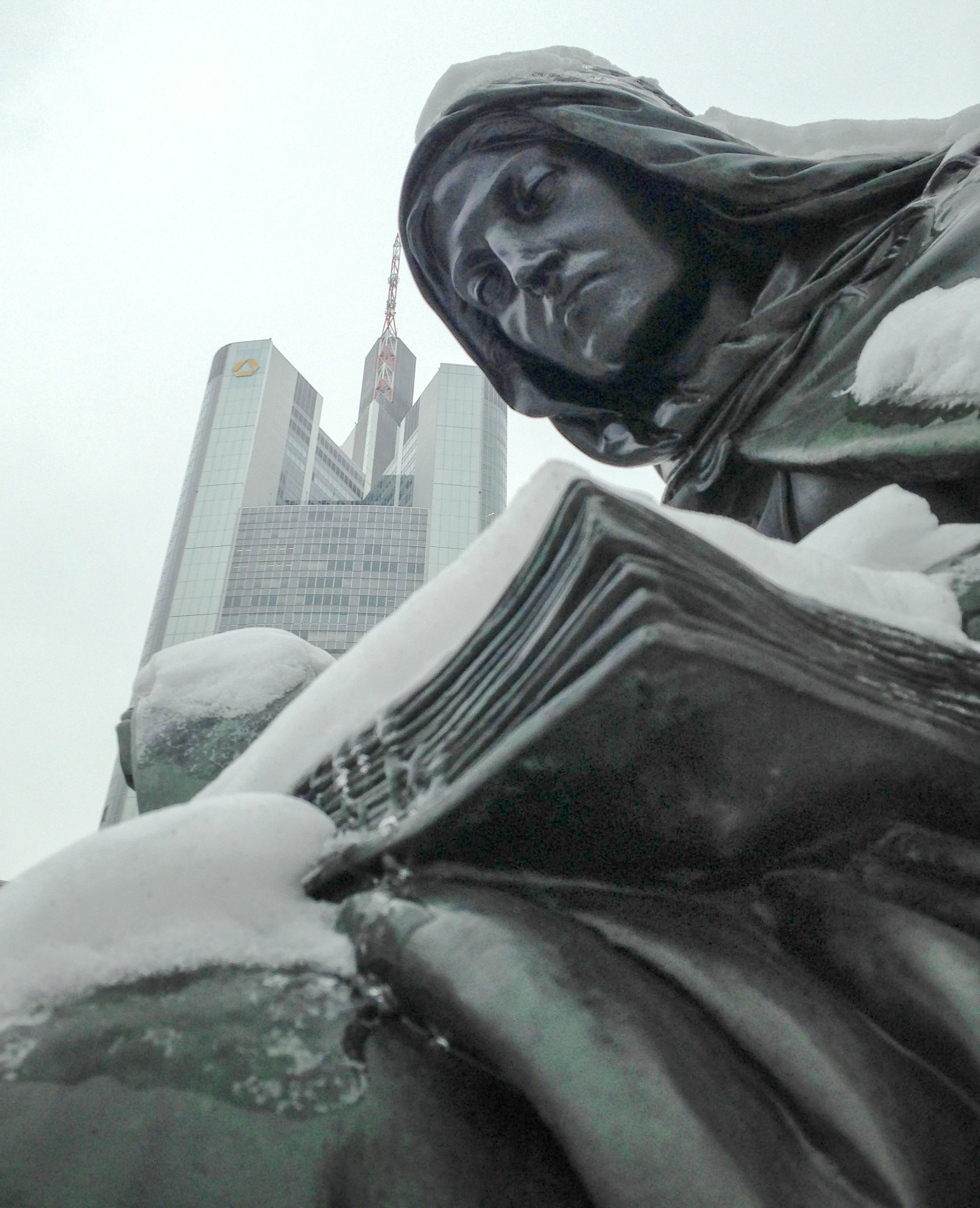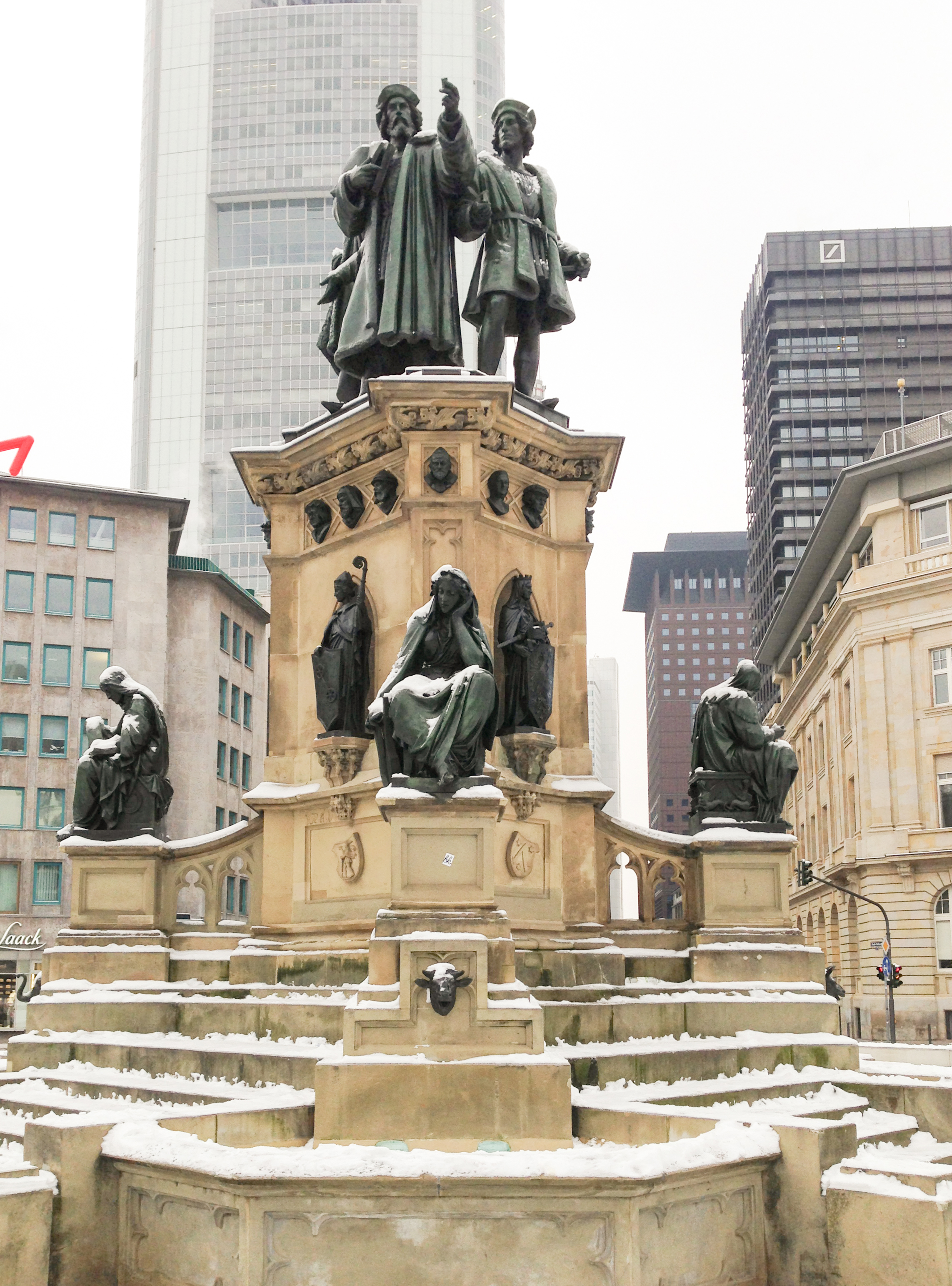 Anbei ein paar Aufnahmen vom Roßmarkt in Frankfurt.                                                       Der Brunnen ist das Gutenberg-Denkmal. Es wurde 1840 erstellt. Eine der Figuren auf der obersten Plattform stellt Gutenberg dar, der ein paar Jahre in Frankfurt lebte. Die 4 Figuren eine Etage tiefer sind Allegorien auf Technik, Poesie, Naturforschung und Industrie.