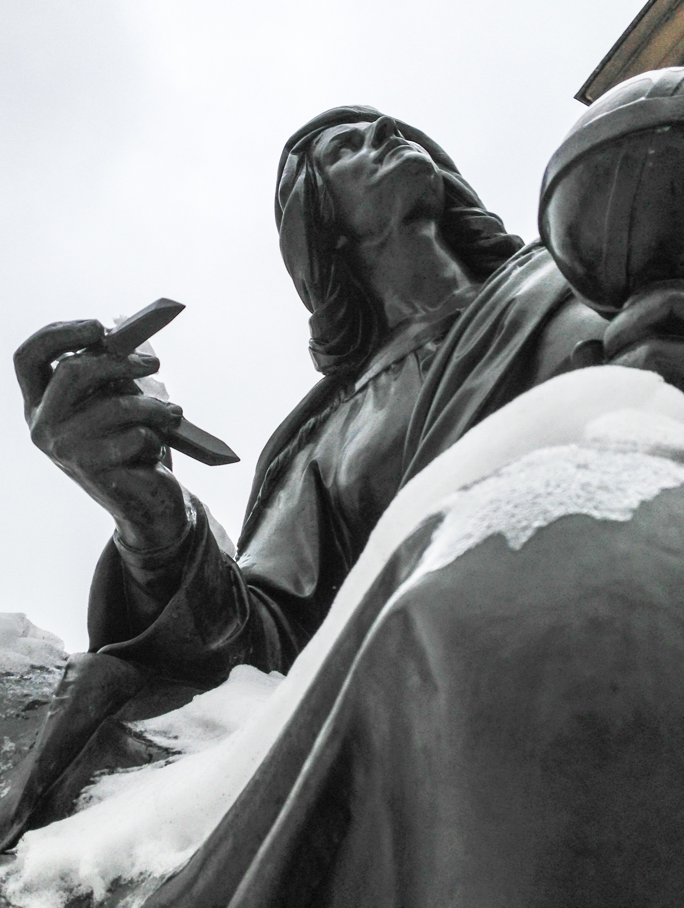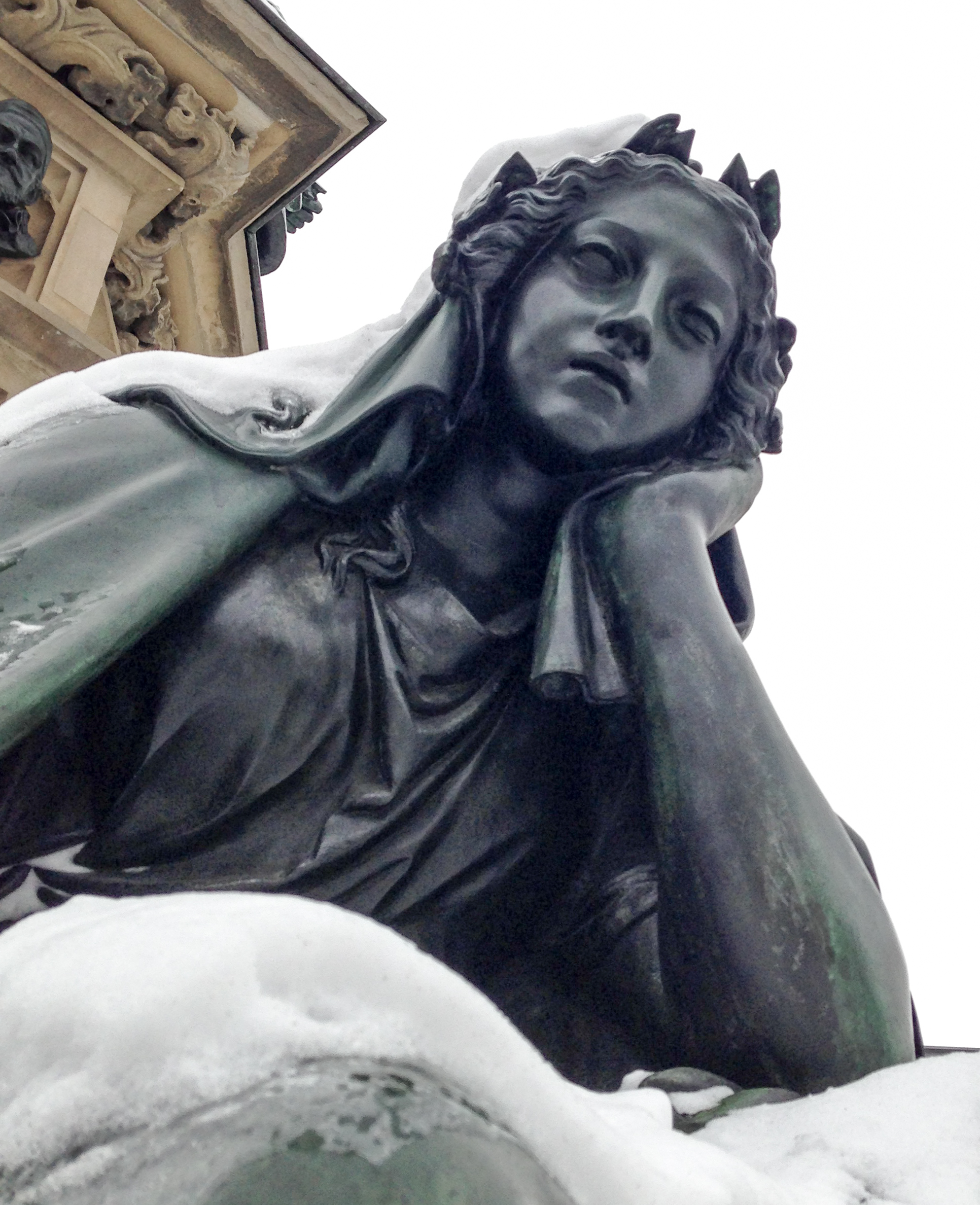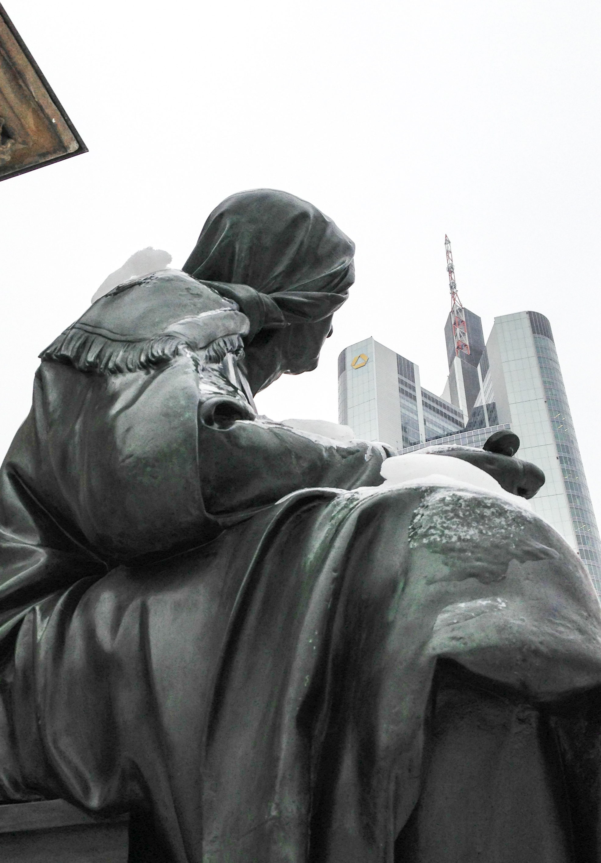 Anbei ein paar Aufnahmen vom Roßmarkt in Frankfurt.                                                       Der Brunnen ist das Gutenberg-Denkmal. Es wurde 1840 erstellt. Eine der Figuren auf der obersten Plattform stellt Gutenberg dar, der ein paar Jahre in Frankfurt lebte. Die 4 Figuren eine Etage tiefer sind Allegorien auf Technik, Poesie, Naturforschung und Industrie.