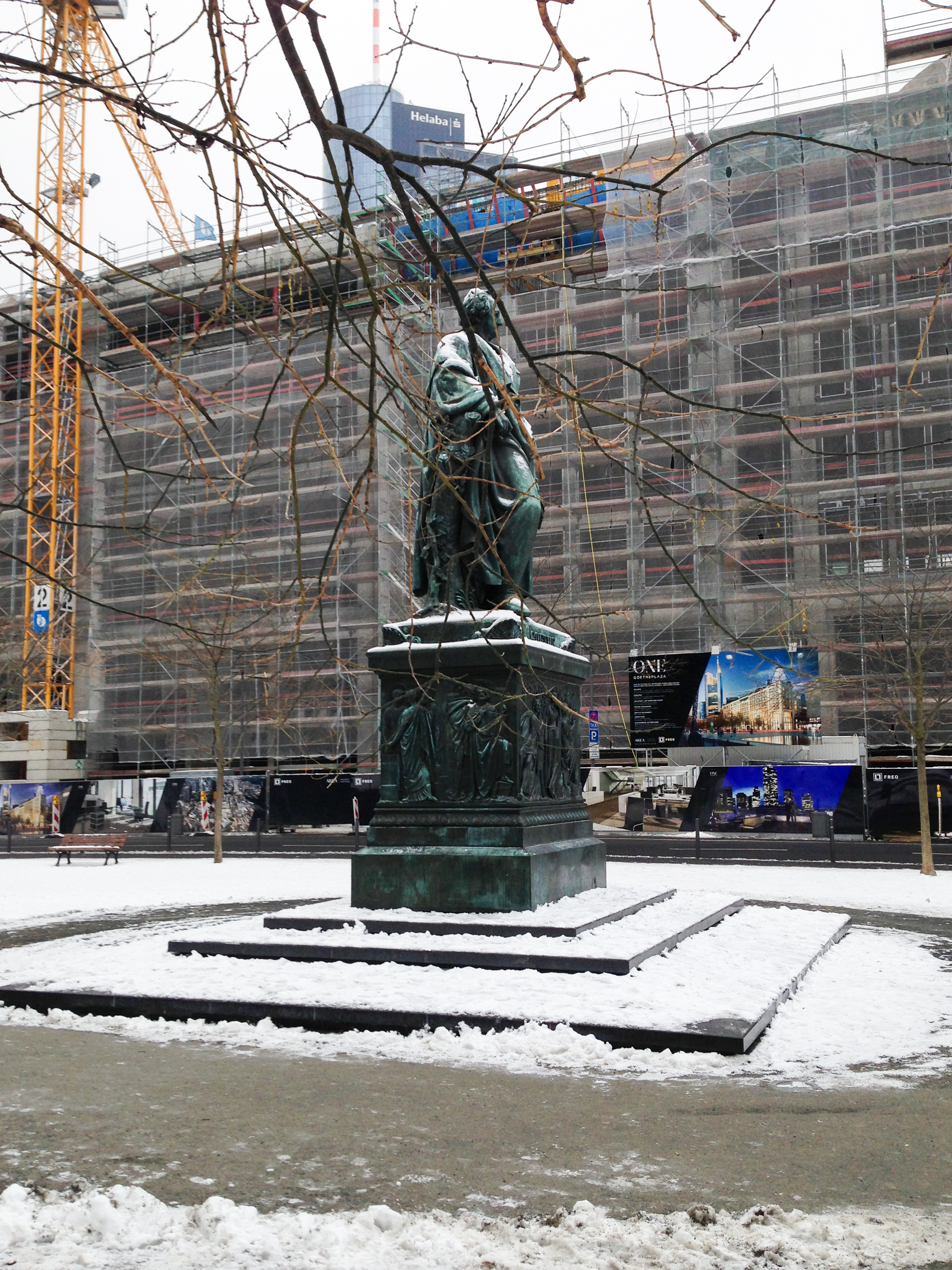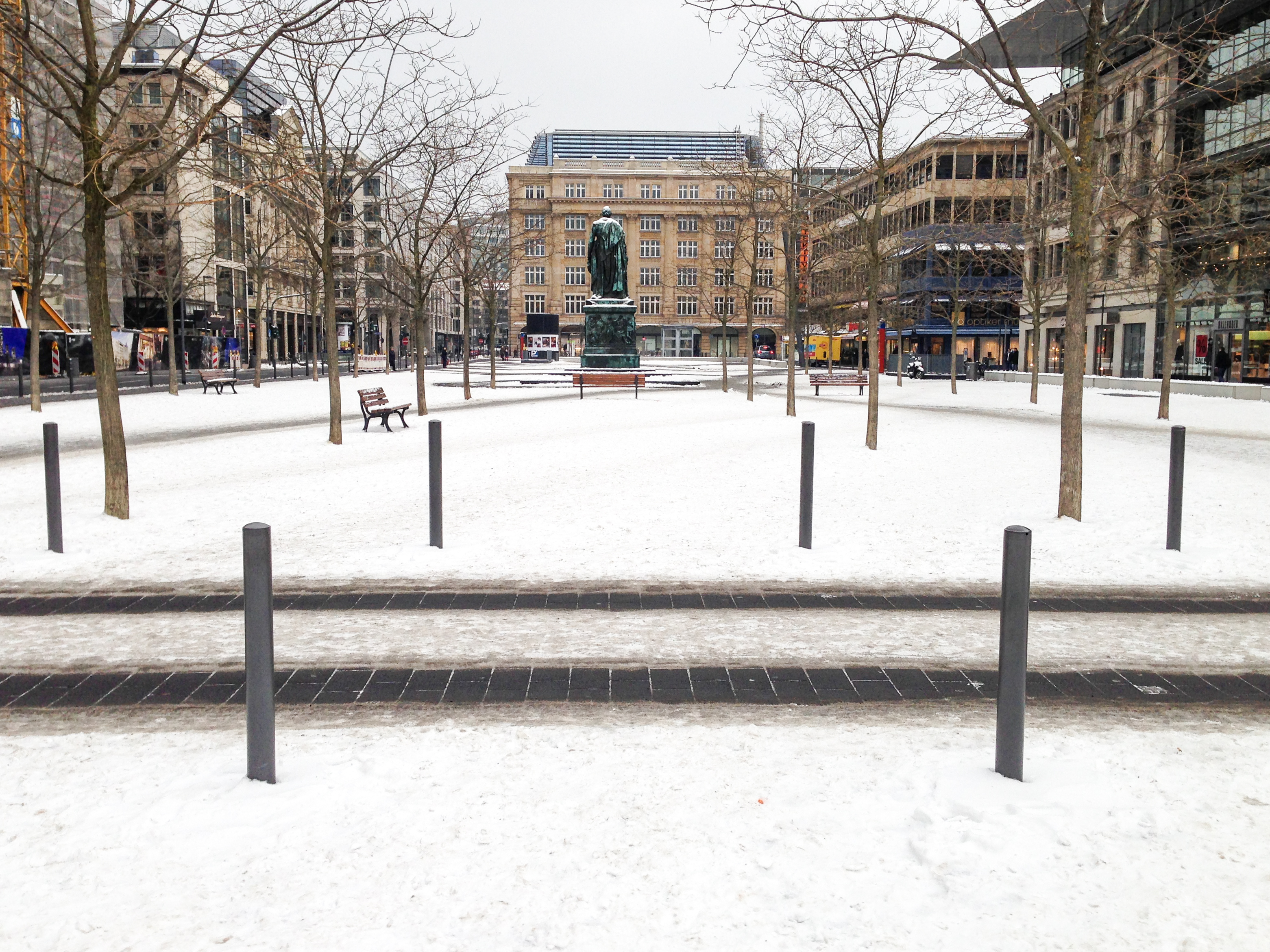 Der Herr auf dem Podest am Ende ist Herr Goethe, der natürlich in Frankfurt einen eigenen Platz hat. Roßmarkt und Goetheplatz gehen ineinander über.